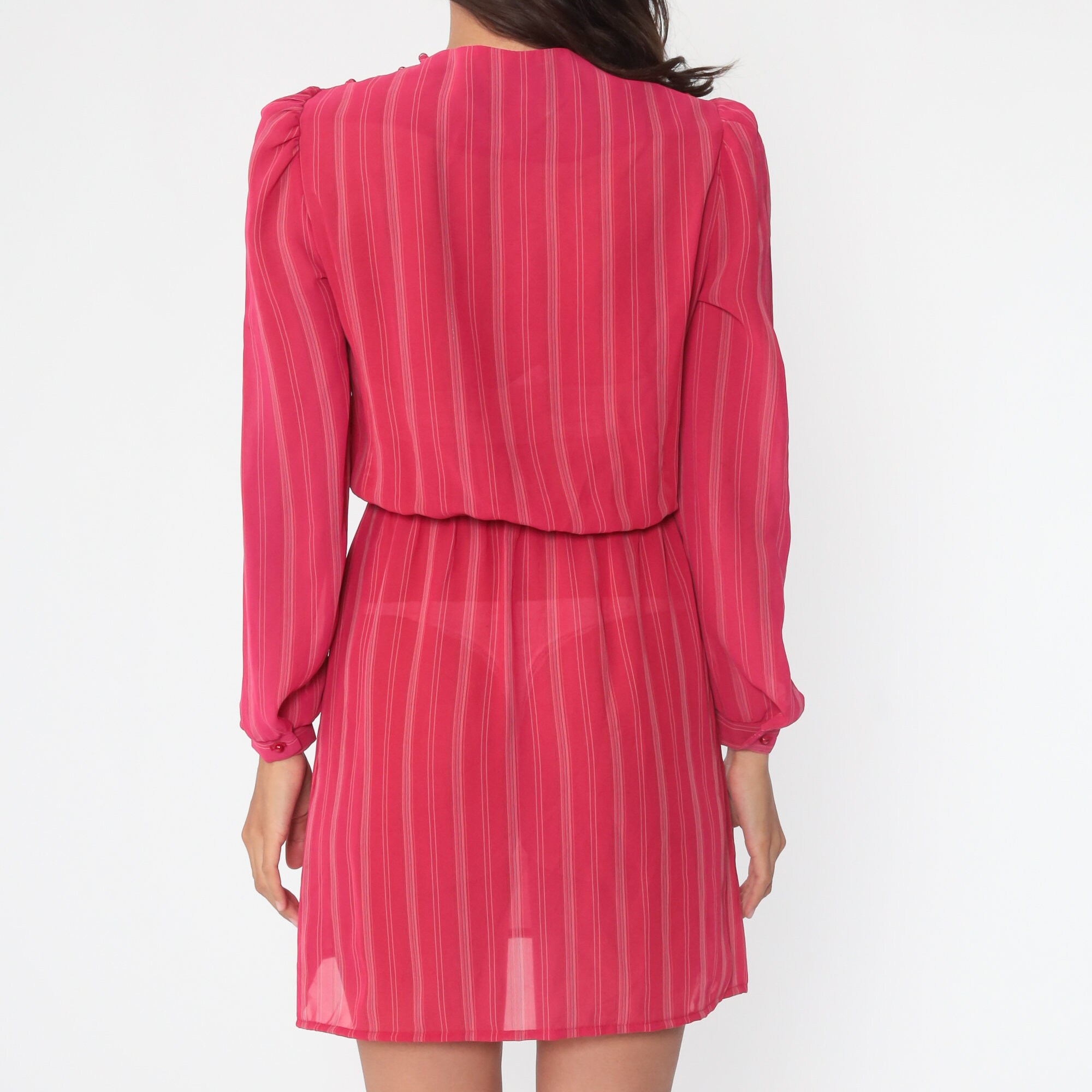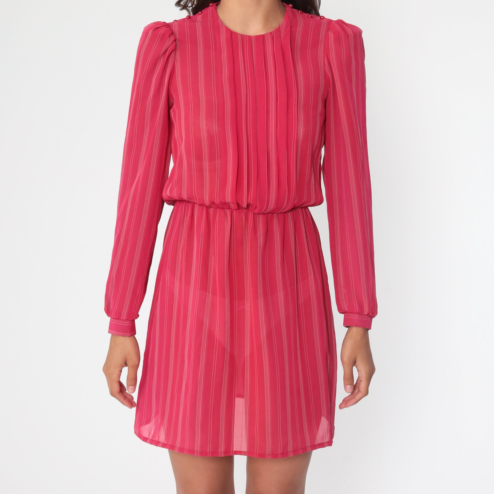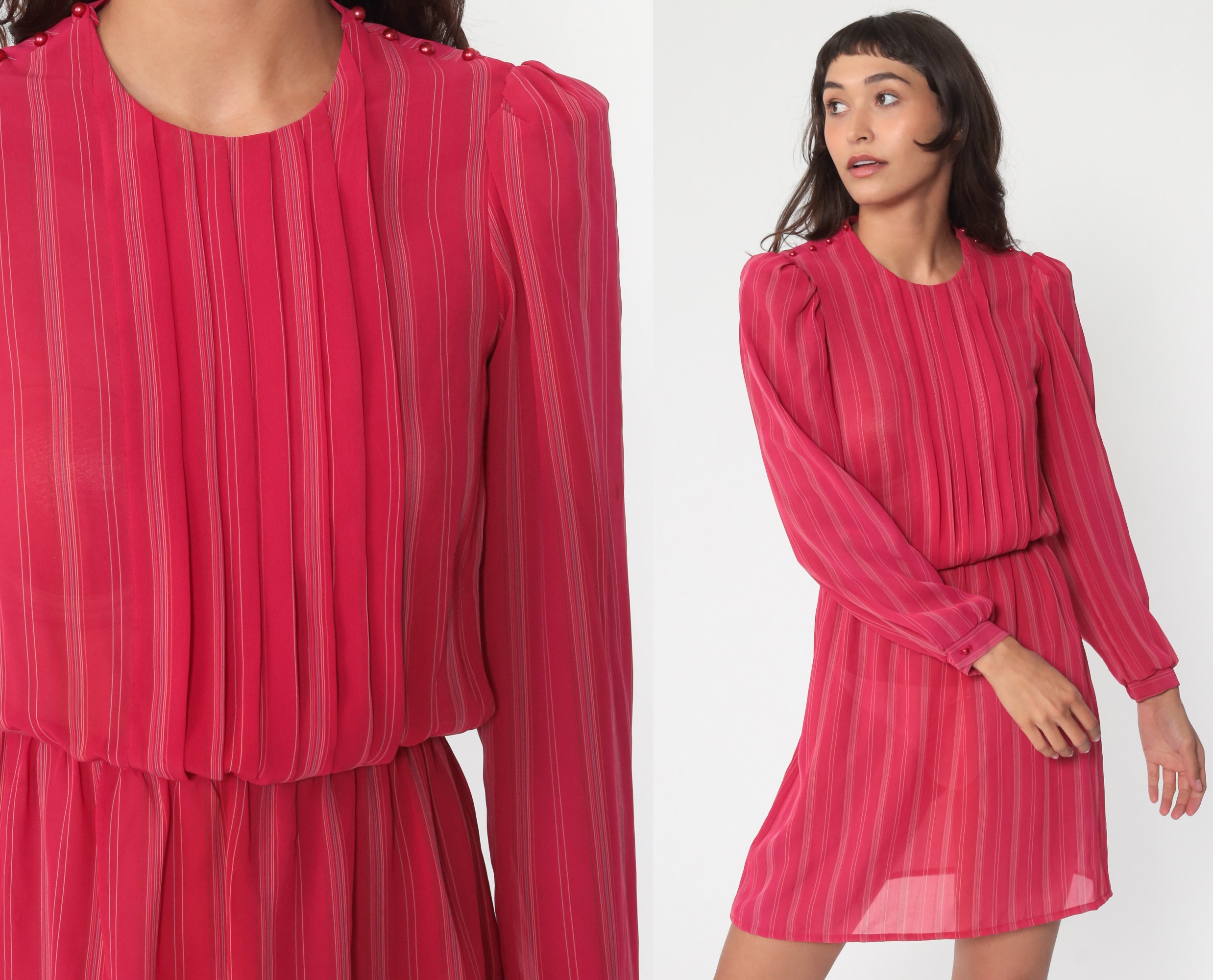 Vintage 80s dress in a sheer red striped print with puff sleeves.