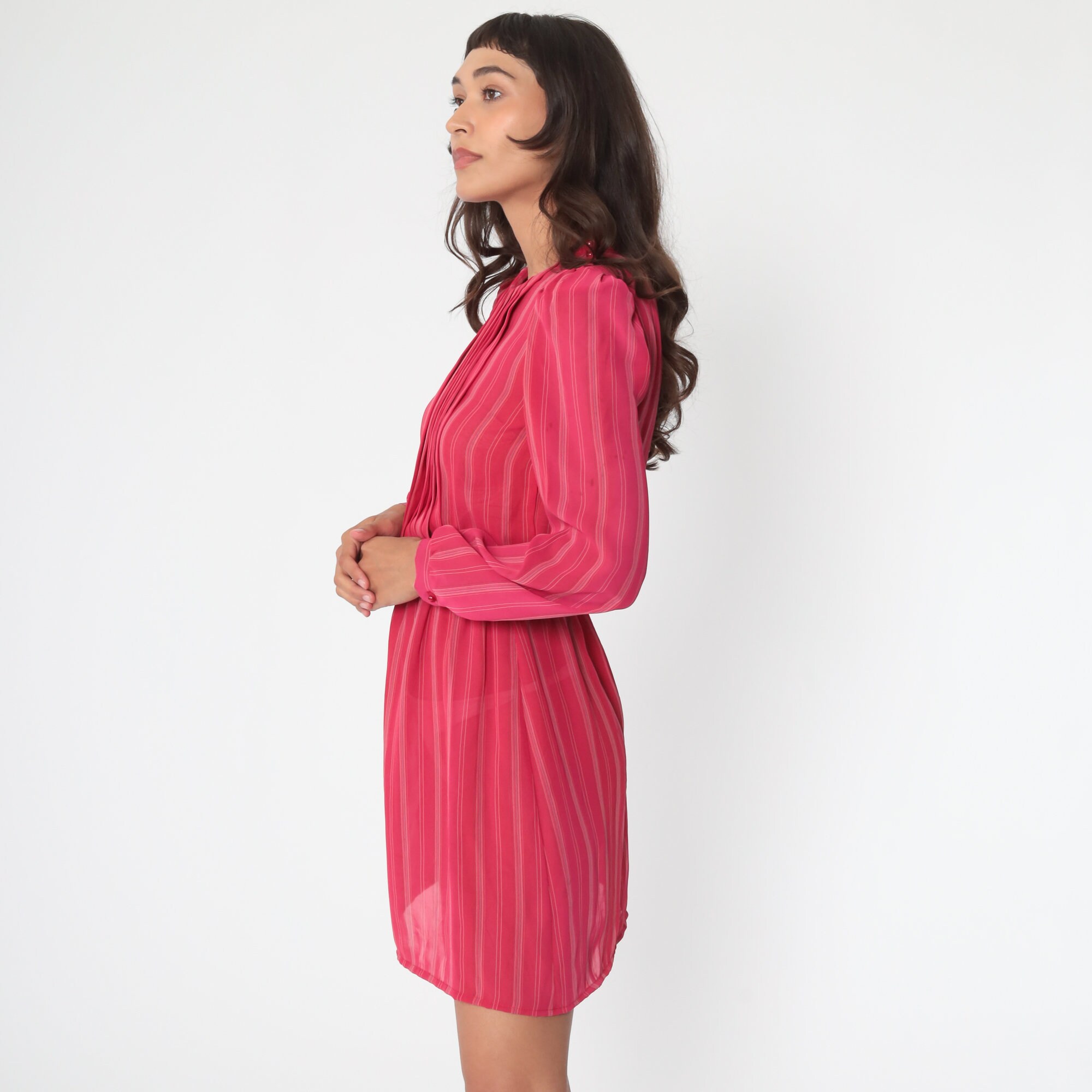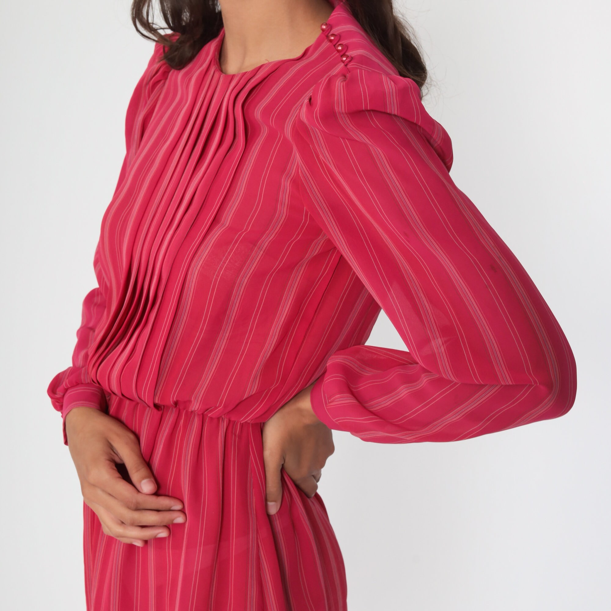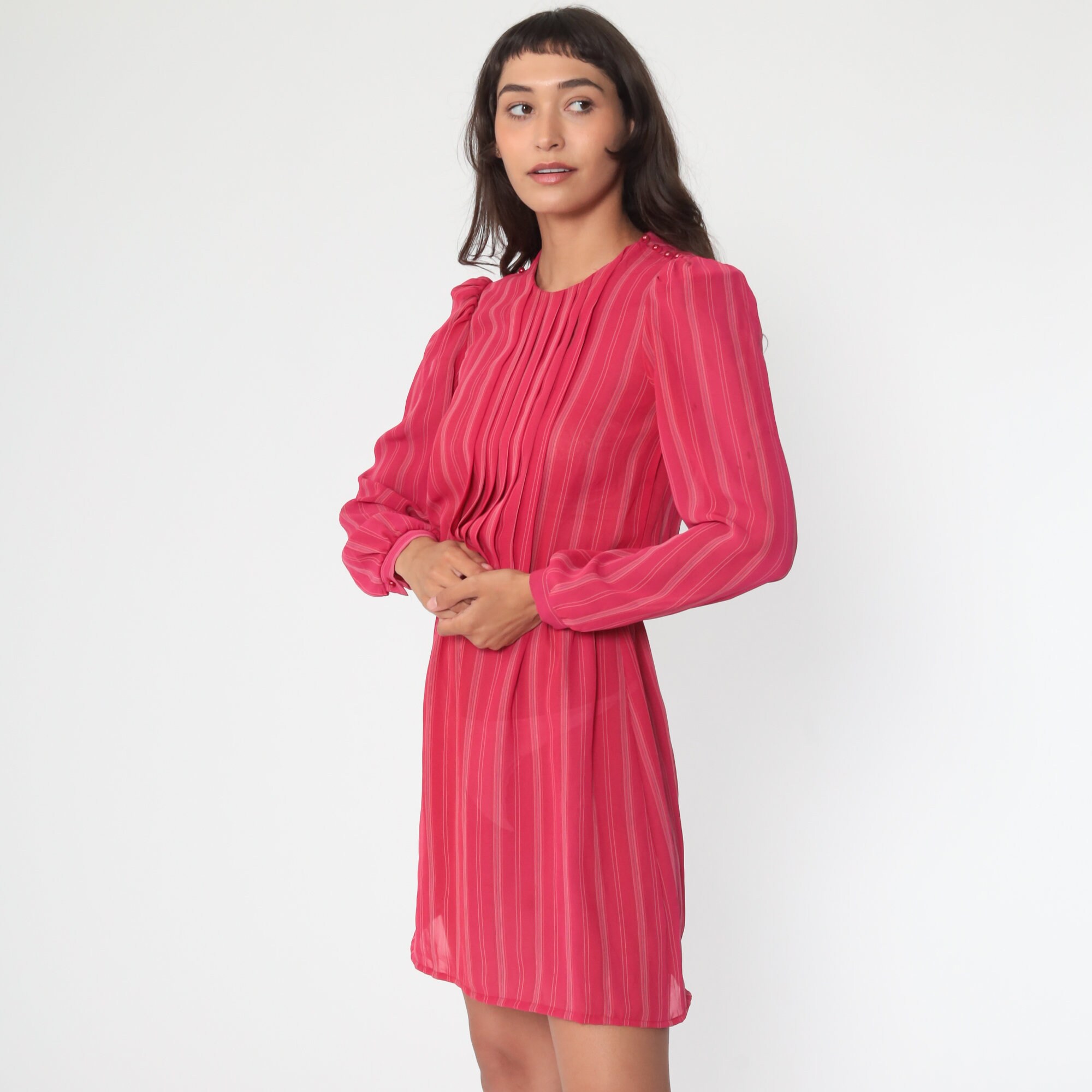 Vintage 80s dress in a sheer red striped print with puff sleeves.